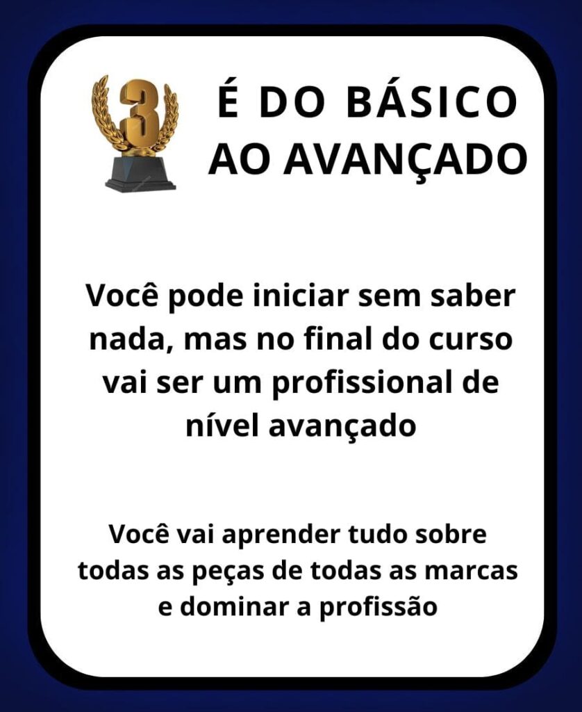 Não, o nosso curso tem uma grade curricular organizada em passo a passo do básico ao avançado, você vai aprender desde conhecer as ferramentas, testar peças e realizar os serviços mais técnicos pois o curso é do básico ao avançado e você vai aprender tudo que precisa para iniciar e se destacar na profissão.