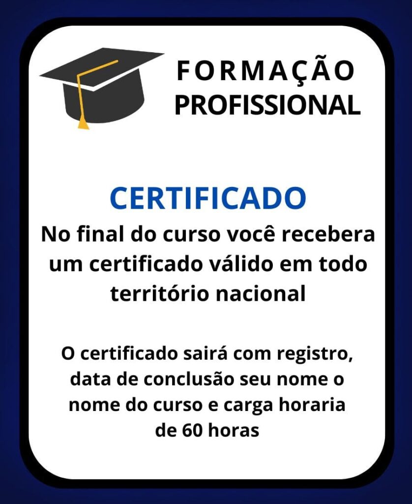 Após concluir o curso você recebera um certificado válido em todo território nacional com registro, carga horária de 60h, seu nome, nome do curso e data de conclusão.